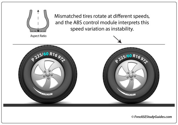 The ABS control module monitors each wheel’s rotational speed through its wheel speed sensor. While the system normally ignores small variations, it may intervene when one wheel begins spinning noticeably faster or slower than the others. Mismatched tires naturally rotate at different speeds, and the module can interpret this difference as instability. A smaller, lower‑profile tire will spin faster than a taller tire, and tires with significantly different tread depths can create the same effect. When these speed discrepancies exceed the system’s allowable threshold, the control module may activate the ABS in an attempt to correct what it perceives as a potential skid or lockup. Mismatched tires can place uneven loads on the drivetrain drivetrain components and the tires themselves.
