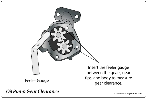 Visually inspect the gears and body for wear. Then, insert the feeler gauge between the gears, gear tips, and body to measure gear clearance.