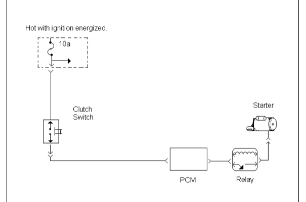 The clutch switch requires that the clutch pedal be depressed before starting the vehicle. Both of these switches are tested with an ohmmeter. Check the ignition switch to ensure it provides power to the starting circuit when placed in the start position. Starter relays are devices that use low current to control high current components.