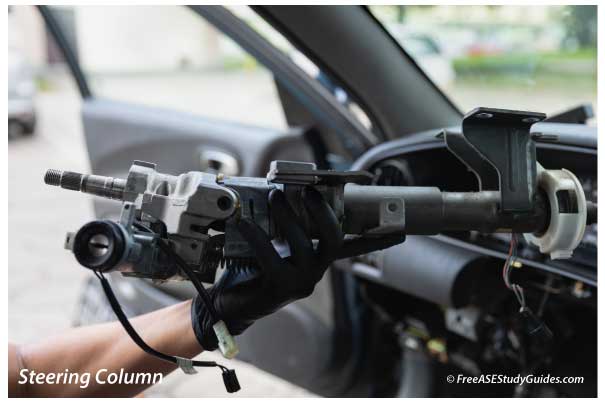 Steering columns and wheels typically have electrical issues, looseness, play, or problems with the tilt mechanism. They have a clockspring, universal joints, and a shaft with vibration insulators and bearings at the top and bottom. Any of these components can wear and cause noise.