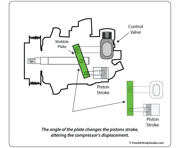 The pistons are attached to an axial wobble plate that changes its angle based on the difference in pressure between the top of the piston and the housing. When cabin temperatures are warm and air conditioning demand is high, the low side pressure is also high. During this time, the compressor's wobble plate is moved to its greatest angle, increasing the piston's stroke and providing maximum refrigerant displacement. As demand decreases, the wobble plate is moved to a lesser angle, providing lesser or minimum output.